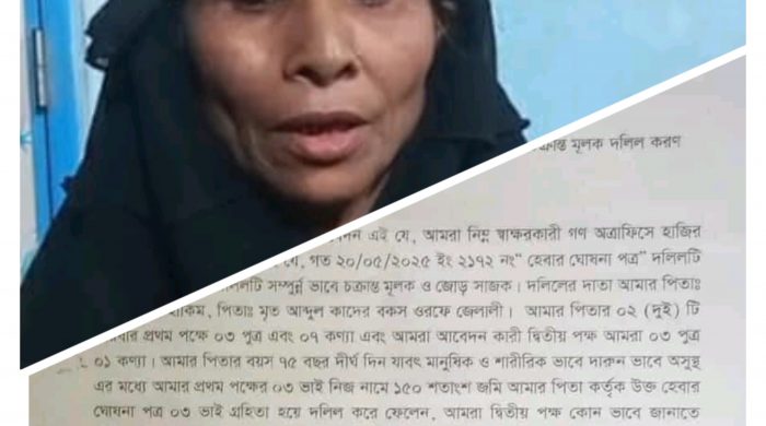 গত ২০/০৫/২০২৫ ইং ২১৭২ নং” হেবার ঘোষনা পত্র” দলিলটি সম্পাদিত হয়। উক্ত দলিলটি সম্পূন্ন ভাবে চক্রান্ত মূলক ও জোড় সাজক। দলিলের দাতা পিতাঃ মোঃ আব্দুল হাকিম, পিতাঃ মৃত আব্দুল কাদের বকস ওরফে জেলালী। আমার স্বামীর ০২ (দুই) টি পরিবার প্রথম পক্ষে ০৩ পুত্র এবং ০৭ কণ্যা এবং দ্বিতীয় পক্ষ ০৩ পুত্র ০১ কণ্যা। আমার স্বামীর বয়স ৭৫ বছর, দীর্ঘ দিন যাবৎ মানুষিক ও শারীরিক ভাবে অসুস্থ এর মধ্যে আমার প্রথম পক্ষের ০৩ ভাই নিজ নামে ১৫০ শতাংশ জমি আমার পিতা কর্তৃক উক্ত হেবার ঘোষনা পত্র ০৩ ভাই গ্রহিতা হয়ে দলিল করে ফেলেন, আমরা দ্বিতীয় পক্ষ কোন ভাবে জানতে পারিনা। পরদিন লোক মাধ্যমে জানাতে পারি প্রথম পক্ষের ভাইরা দলিল করে নিয়েছে। তৎক্ষনাত সাব-রেজিষ্টার অফিসে গিয়ে খোজ খোবর নিয়ে দেখি পিতা সাজিয়ে দলিলটি হয়। তখন অফিসে গিয়ে উক্ত দলিলের জাবেদা নকল টি তুলি ইতি পূর্বে ঐ পক্ষ ১৩/০৫/২০২৫ ইং হেবার ঘোষনা পত্র দলিলটি সম্পাদিত করিতে চাইলে পিতার অনুপস্থিতে চক্রান্ত দলিলটি সম্পাদন করতে পারে নাই। তারপরও তারা ক্ষান্ত না হয়ে ২০/০৫/২০২৫ ইং তারিখে পিতা সাজিয়ে চক্রান্ত মূলক দলিল টি সম্পাদন করে ফেলে। এখানে আরো ব্যক্ত করা আবশ্যক যে আম শালিসের মধ্যে উপস্থিত ১ নং স্বাক্ষী মোঃ ছয়ফুর রহমান, পিতাঃ মৃত আব্দুল কাদের বকস ওরফে জেলালী বলেন দ্বিতীয় পক্ষের ০৩ পুত্রের ০১ পুত্র মোঃ মিজানুর রহমান যে চক্রান্তকারী তার প্রমান হলো বাবার কাছ থেকে একই দিনে একই তারিখে একই নম্বর দিয়ে ৯.৫০ শং ও ৩৪.৫০শং জমির দলিল করে নেন। যাহার দলিল নং ৫৭১১/২৩ তারিখ ০৫/১১/২৩ ও ৫৭১১/২৩ তারিখ ০৫/১১/২৩ ইং। উপর দিকে দাতা আব্দুল হামিক একজন শিক্ষিত ব্যাক্তি তার প্রমান হলো বিগত ০৫/০৭/৯৮ ইং তারিখে ৩৩৯৪ নং দলিলটি নিজ স্বাক্ষরে মোঃ সৈয়ফুর রহমান, পিতা মৃত আব্দুল কাদের বকস ওরফে জেলালী এর নিকট বিক্রয় করে উক্ত দলিলটি আবেদনে সংযুক্ত থাকবে।