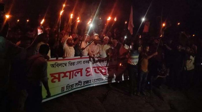 কুড়িগ্রামের রাজারহাটের ঘড়িয়ালডাঙা ইউনিয়নে বুড়িরহাট বাজার এলাকায় তিস্তা তীরে হাতে জ্বলন্ত মশাল নিয়ে জড়ো হয় হাজারো মানুষ। বাদ্যযন্ত্রের তালে‘ জাগো বাহে, তিস্তা বাঁচাই’ শ্লোগান তুলে ঘন্টাব্যাপী কর্মসূচি পালন করেন তারা। নিজেদের অস্তিত্ব রক্ষায় নদী তীরে দাঁড়িয়ে গলা ছেড়ে তিস্তা নদী বাঁচানোর আকুতি জানান। এসময় তিস্তা তীরে প্রজ্জ্বলিত মশালের আলো নদীর পানিতে জ্বলন্ত প্রতিবিম্ব তৈরি করছিল। যেন তীরবর্তী বাসিন্দাদের দাবির স্ফুলিঙ্গ।